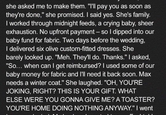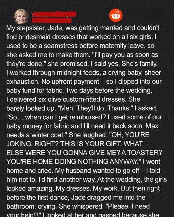 I also overheard Jade bragging to a friend, “The dresses were basically free labor. My stepsister’s desperate for something to do since she’s stuck at home with the baby. Some people are just easy to manipulate.”