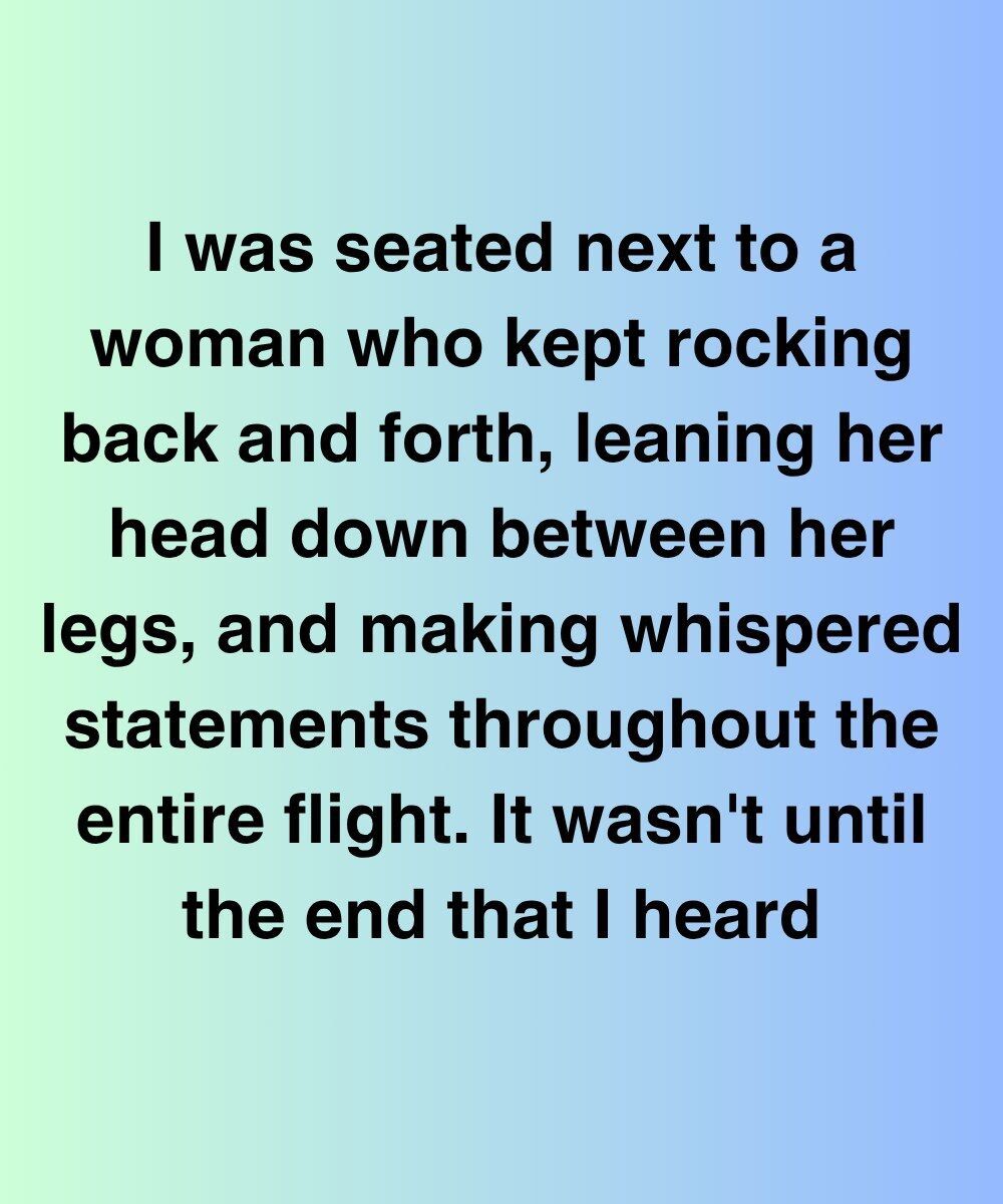 Just rocked slightly in her seat, whispering to herself like she was counting down to something. At first, I thought it might be a fear of flying. I’ve known folks who get super nervous in the air.