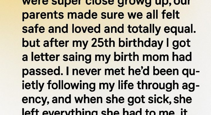 Now she was gone. And she had left me everything.My adoptive parents were… stoic. They’d always been open about my adoption, in a clinical sort of way. “She was young, sweetheart, she made a difficult choice for your future.” That’s all I ever got. No bitterness, no curiosity, just a closed chapter. Now, with this news, they just nodded. “It’s your inheritance,” my adoptive father said, his voice tight, I remember now, too tight. My adoptive mother just squeezed my hand, a gesture of comfort that felt hollow. Did they know? Had they always known something more?