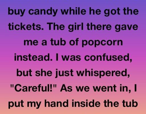 I looked around, but my date was already walking toward our theater, excitedly chatting about how this film got amazing reviews. I followed him, holding the popcorn like it was ticking. Once we sat down, he leaned over and grabbed a handful.I flinched. I didn’t want him to see the note. I casually turned the tub so it faced me and pretended to eat.