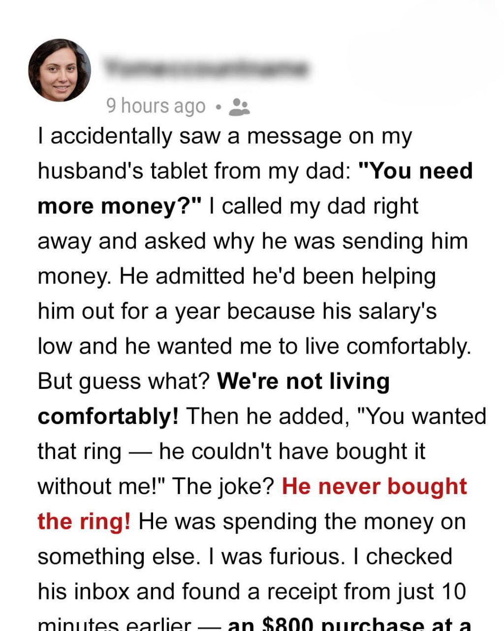 I was broken. But a different kind of ache started when I spoke to my dad. I couldn’t bear to hide it, not from him. When I gently showed him the statements, his face crumpled. My strong, resilient father, weeping. “I just wanted to help him, honey,” he choked out, his voice thick with sorrow. “He came to me, said he was in trouble, a huge sum. He begged me not to tell you. Said it would break your heart.” He looked so utterly devastated, so heartbroken for me, for the mess his son-in-law had made. My poor dad, caught in the middle, trying to protect us all.