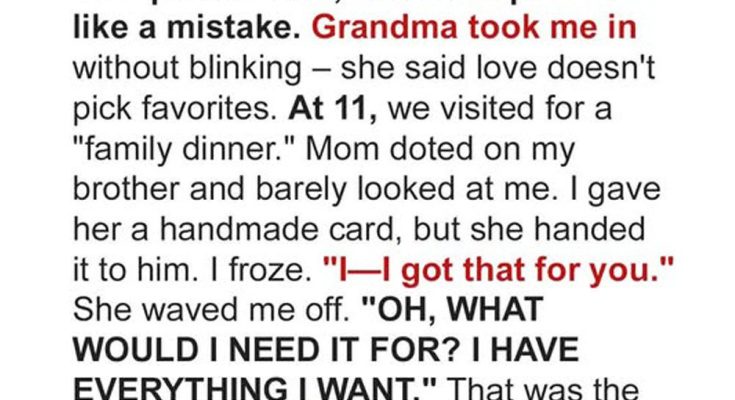 Grandma, tears streaming down her face, looked at my mother with a quiet, devastating triumph. “You wanted her to regret leaving her ‘favorite’?” she whispered, her voice laced with venom. “Well, she left more than that. She left her own daughter to raise your child. And now, she’s lost both of you forever. This isn’t just regret, dear. This is the truth.”