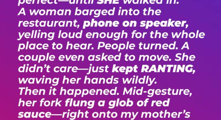 My mother and I were enjoying a rare, elegant dinner when a loud woman barged in, disrupting the entire restaurant. Just as we tried to ignore her, she flung food across the table, splattering sauce onto my mother’s dress. I wasn’t about to let that slide.