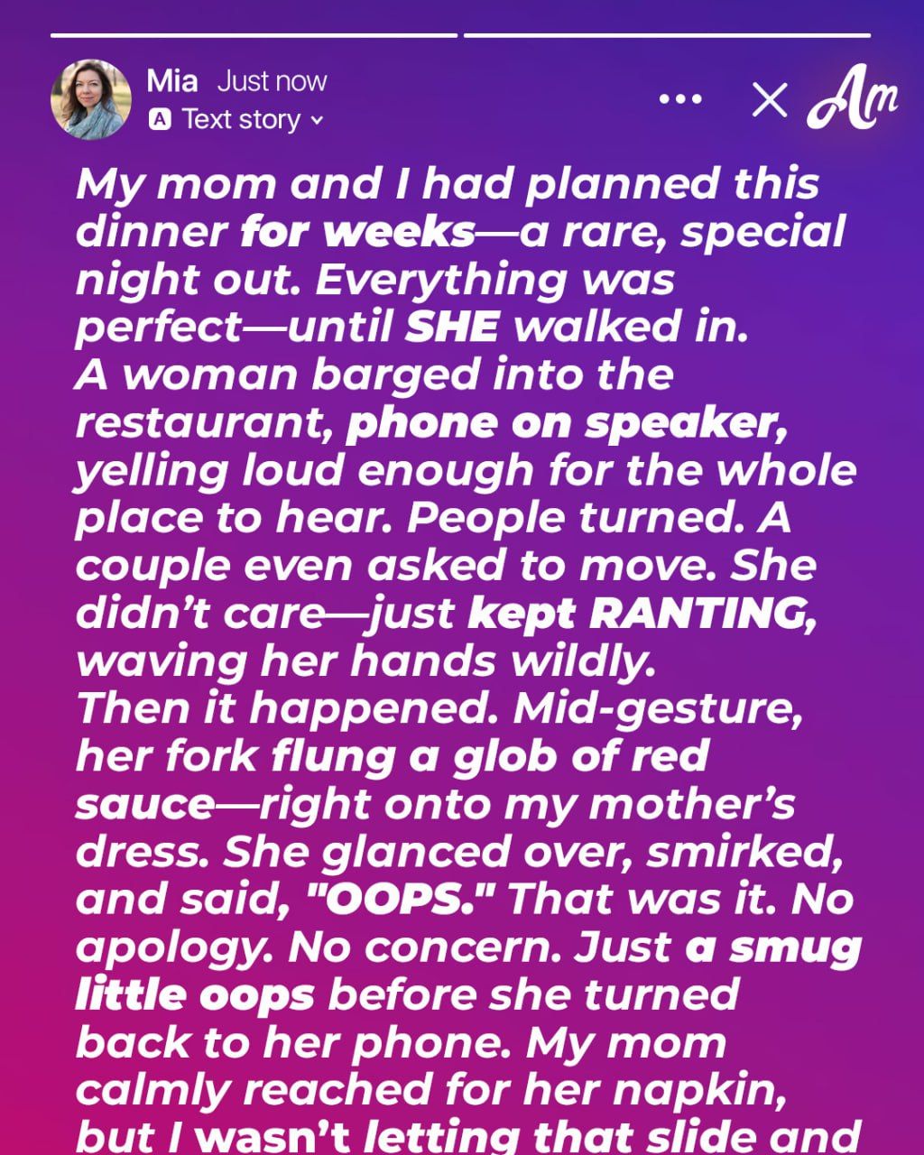 I leaned in, my voice sharp but steady. “Excuse me, you just got food all over my mother.”