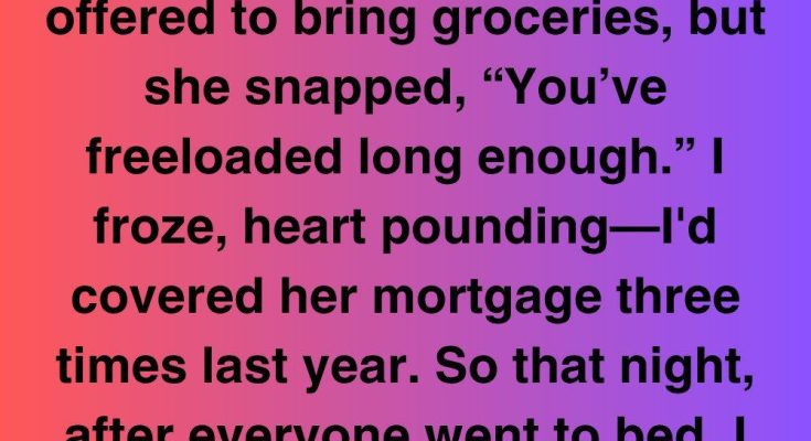 My sister invited us to her new lake house, beaming about the “family weekend we all need.” I offered to bring groceries, but she snapped, “You’ve freeloaded long enough.” I froze, heart pounding—I’d covered her mortgage three times last year.