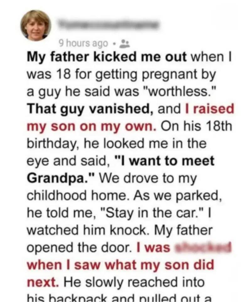 No hug, no goodbye, just the quiet click of the porch light fading behind me. With a small bag in hand and a baby growing inside me, I realized how one instant could strip away everything you thought was safe. Eighteen years later, that baby — my son — would appear at that very door with a message my father would never forget.