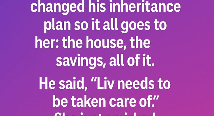 Then, last month, Dad told me he had completely revised his will so that everything would go to her. He said it gently, adding, “Liv needs to be looked after.” But the slight smirk she gave stuck with me.