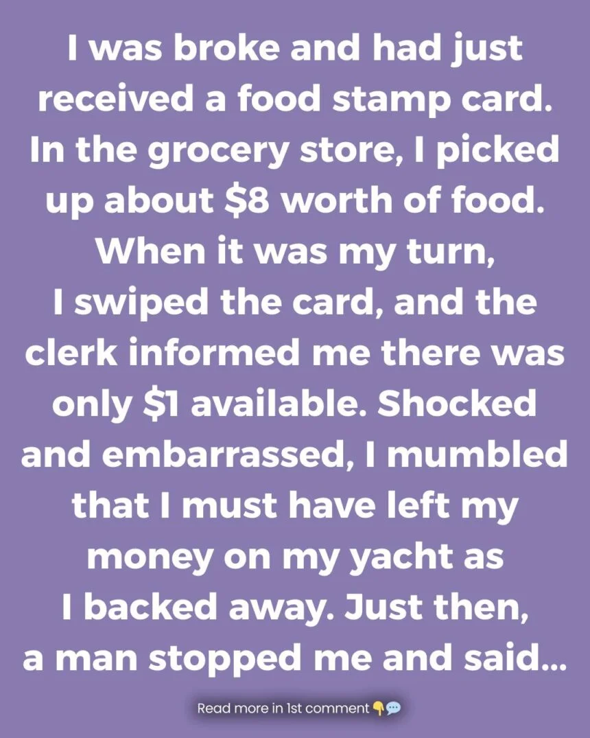I was broke—truly broke—and had just received my food stamp card. That small piece of plastic felt like both a lifeline and a reminder of how far I had fallen. At the grocery store, I carefully gathered about eight dollars’ worth of food: a loaf of bread, some soup, and a few basics to stretch through the week.