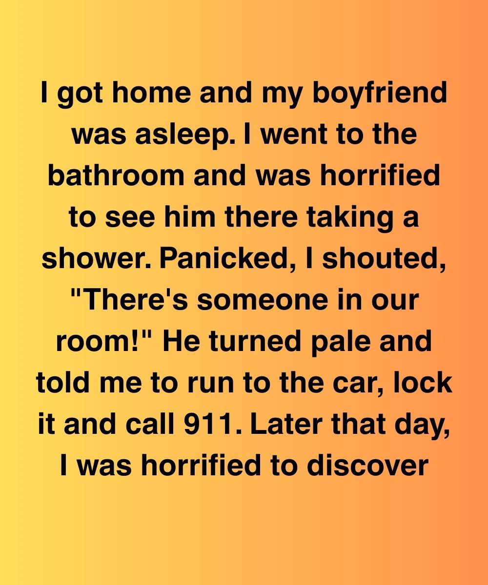 I got home and my boyfriend was asleep. I went to the bathroom and was horrified to see him there taking a shower. Panicked, I shoere’s someuted, “Thone in our room!”