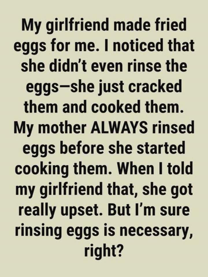 When Evan sat down for breakfast that morning, he expected nothing more than fried eggs and quiet conversation. But as he watched Mira crack the eggs directly into the pan without rinsing them first, a familiar voice from his childhood echoed in his head: “Always rinse the eggs.” His mother had repeated that rule his entire life, and somewhere along the way, it became a law he never questioned.