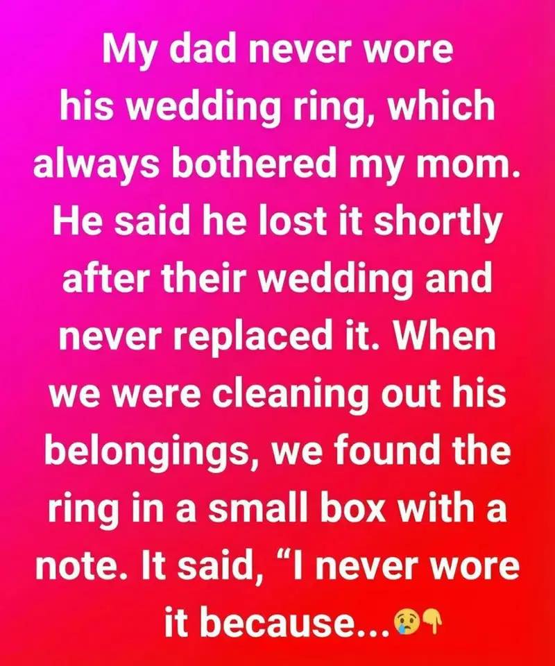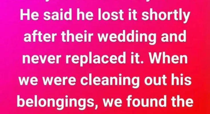 When we began sorting through my dad’s things after he passed, we expected nothing more than the usual odds and ends—old jackets, worn tools, faded receipts. Instead, we uncovered a small box that completely reshaped what we thought we knew about him. Inside lay his wedding ring, carefully wrapped in a soft cloth, along with a handwritten note that began, “I didn’t wear it because…”