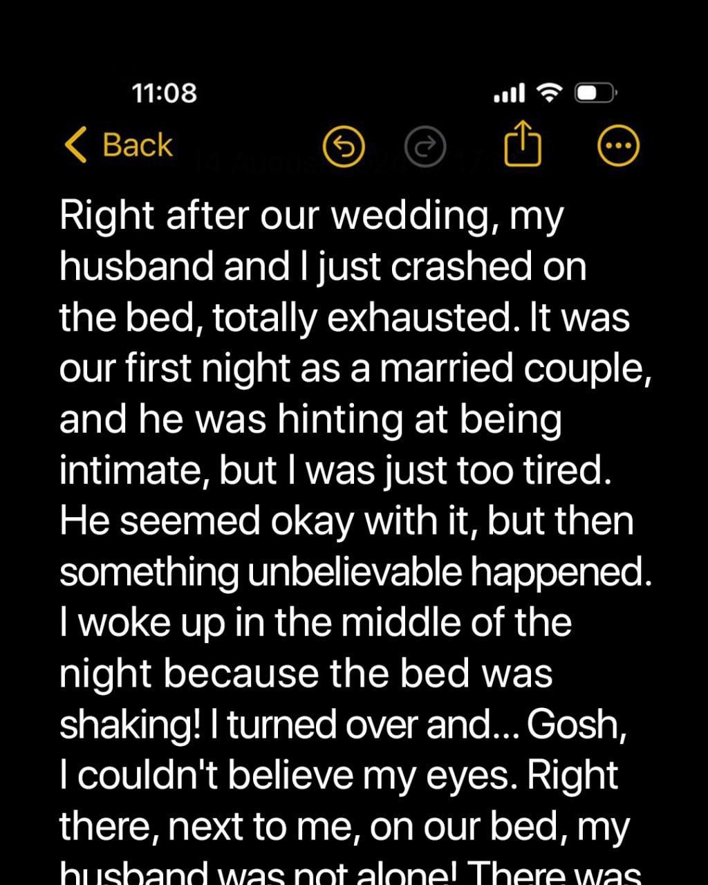 On our wedding night, my husband, Scott, wanted to get intimate with me, but I turned him down, saying I was tired. He understandingly agreed and kissed me goodnight. Suddenly, at midnight, I felt the bed shake and turned to my side, only to freeze at what Scott was doing on our bed.