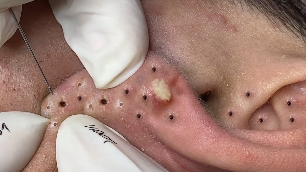 The ear has thicker skin and less frequent exfoliation than the face. As a result, blackheads in this area may remain trapped for months or even years. In the image, you can see multiple dark plugs surrounding inflamed skin, suggesting long-term buildup and pressure beneath the surface.