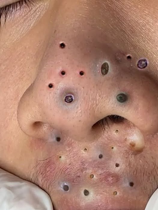 Attempting to squeeze blackheads at home—especially ones as deep as those shown—can lead to: