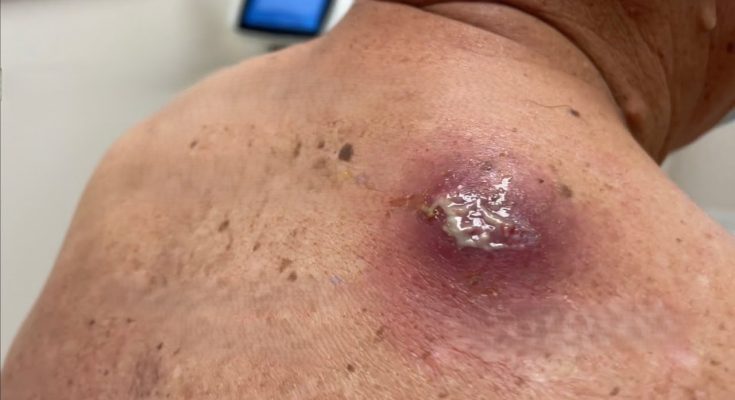 Skin changes can be more than a cosmetic concern. The image shown highlights a severely inflamed skin lesion with swelling, discoloration, and visible fluid accumulation—signs that may indicate a serious skin infection or inflammatory condition that requires prompt medical attention.