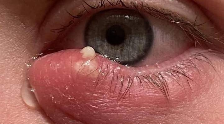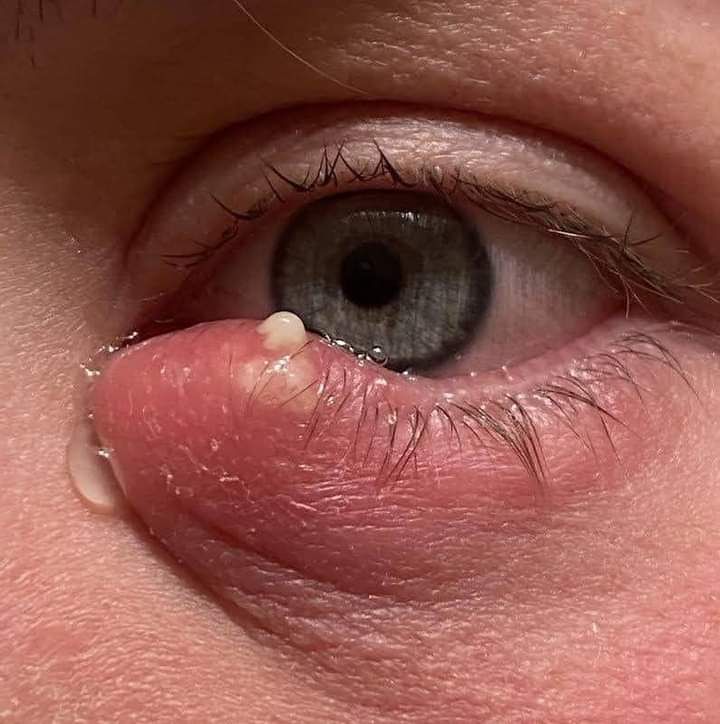 • Large inflamed cyst near the eyelid with active pus extrusion