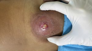 The cyst has a central opening with yellowish discharge