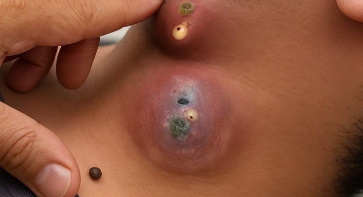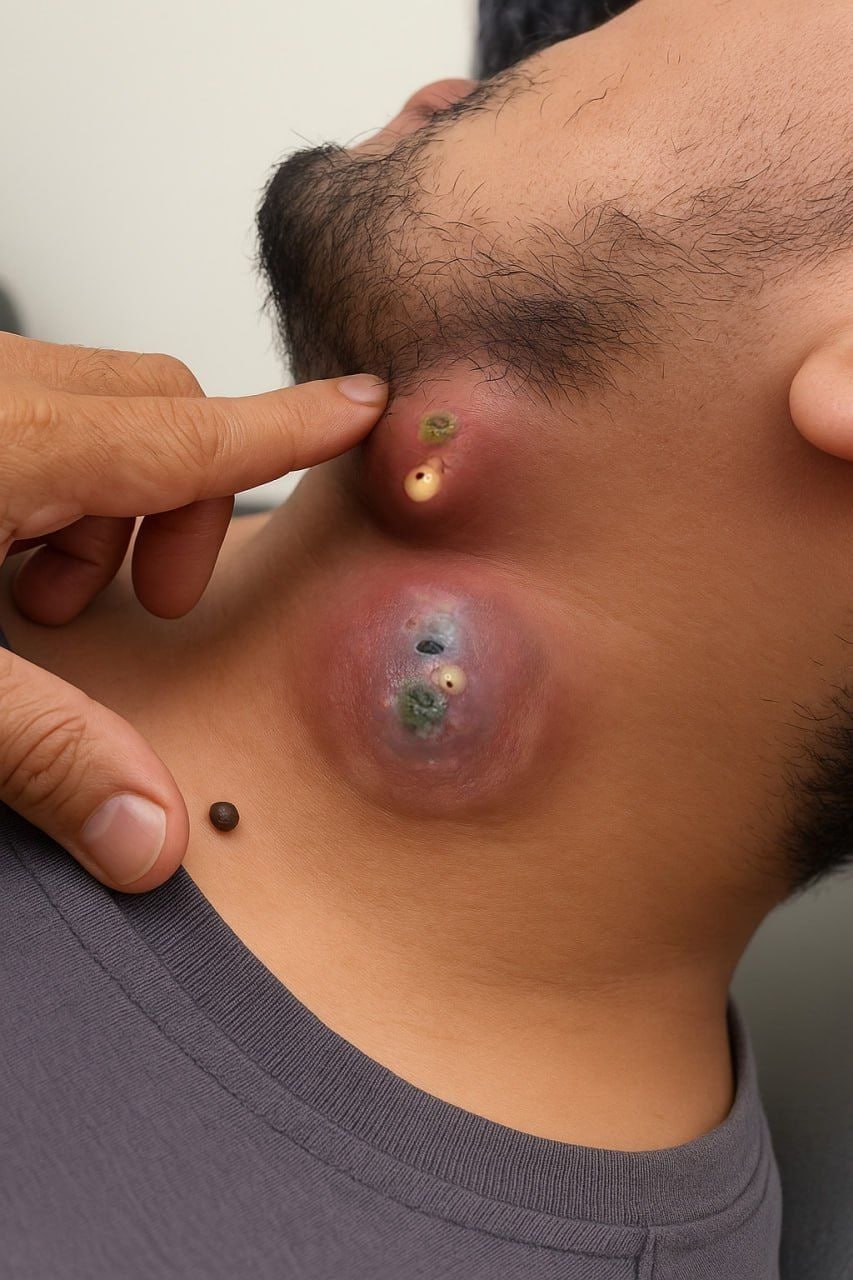 An infected skin cyst, sometimes progressing into an abscess, occurs when bacteria enter a blocked hair follicle or oil gland. The image above shows a severely inflamed neck cyst with visible pus drainage—a sign that the infection has advanced and needs proper medical care.