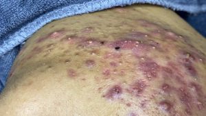 Severe inflammatory acne is a chronic skin condition that goes far beyond common pimples. The images above show advanced acne lesions, including inflamed papules, pustules, nodules, and cystic clusters affecting the face, jawline, neck, and upper body. This type of acne can be painful, persistent, and emotionally distressing if not treated properly.