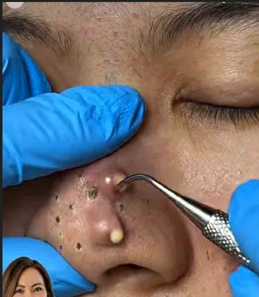 The image above shows a professional skin extraction procedure being performed on the nose using sterile tools and gloves. Visible are multiple blackheads (open comedones) and a pus-filled lesion (pustule) that is being carefully drained by a trained practitioner. This type of treatment is commonly done in clinical or dermatology settings to safely clear clogged pores and reduce inflammation.