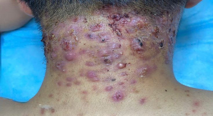 The image highlights severe inflammatory acne or folliculitis on the back of the neck, a condition that requires medical evaluation and proper treatment. While mild acne is common, severe cases can cause lasting scars if not managed appropriately.