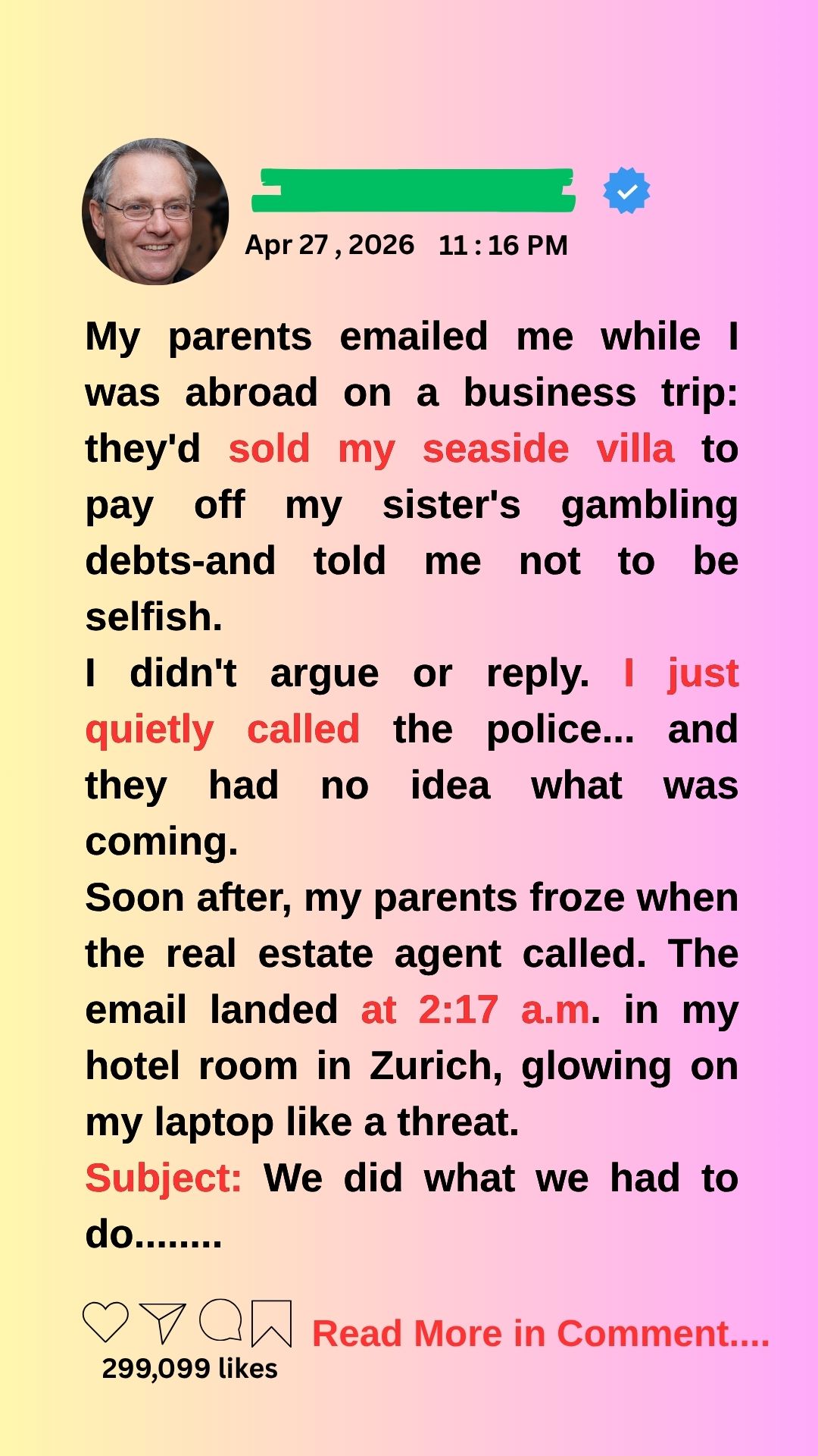 “Madeline,” my mother wrote. “We sold the seaside villa. Your sister’s situation is serious. Don’t be selfish. Family comes first.”