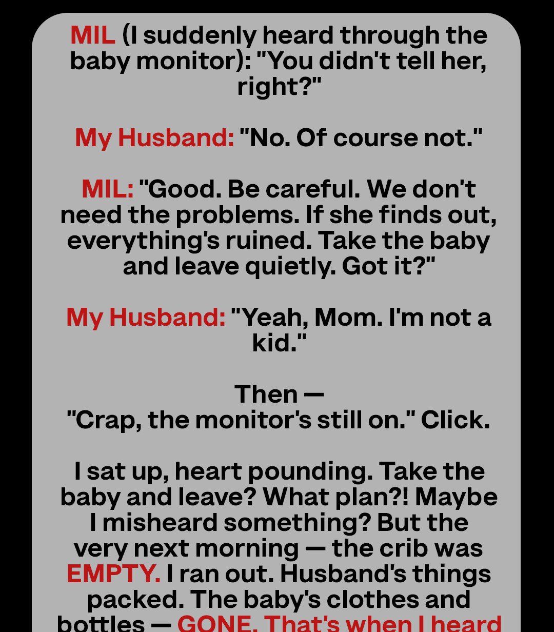 I swung my legs over the edge of the bed but stayed seated, gripping the mattress. I couldn’t storm outside. Not yet. If they were truly plotting something, I needed to understand it first. I needed to be smart, not hysterical. That’s what they’d expect, right? Me overreacting. Being the emotional, unstable new mom.